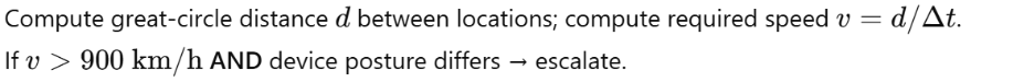 - Plain English: “No human could have realistically moved that fast, so this login pair is highly suspicious.”